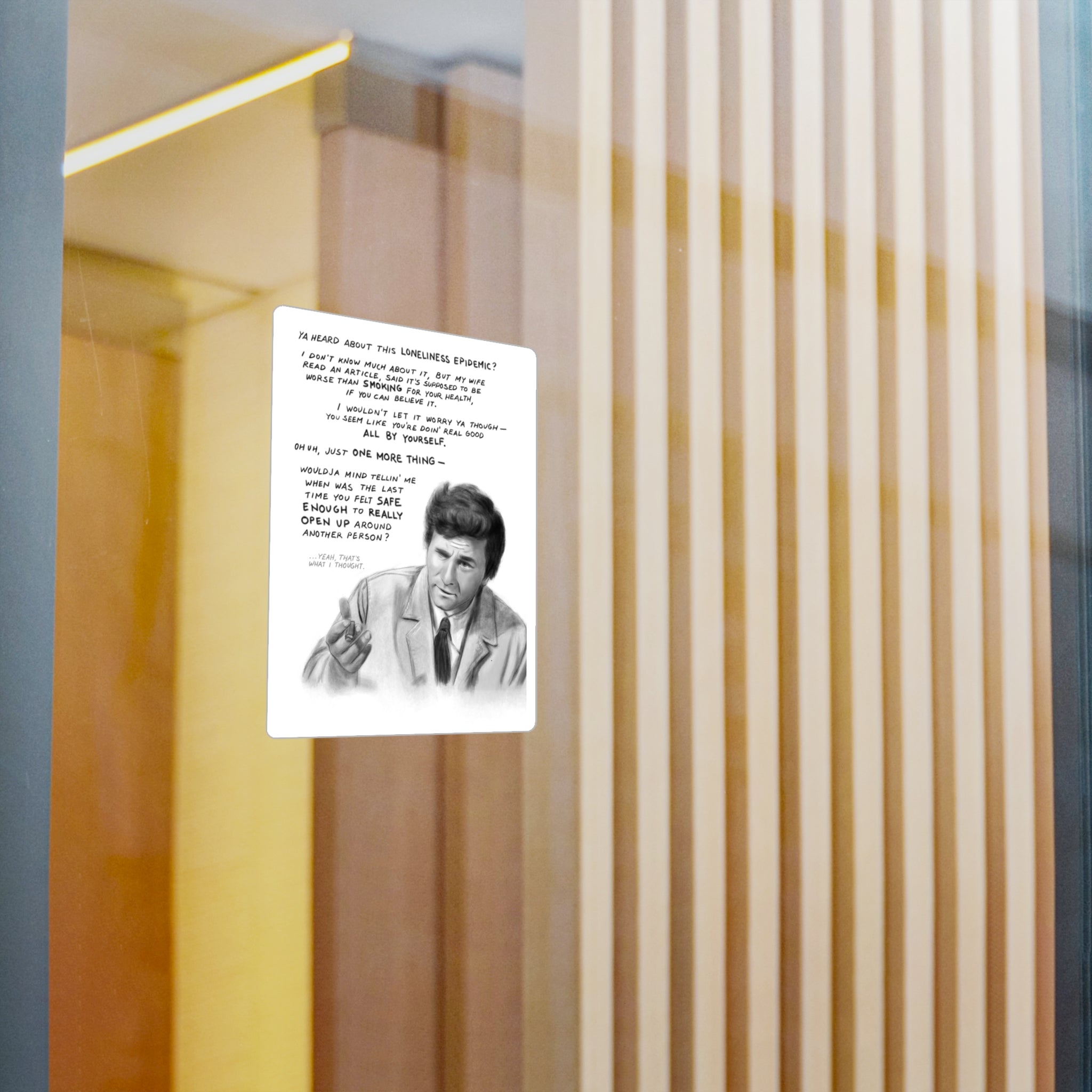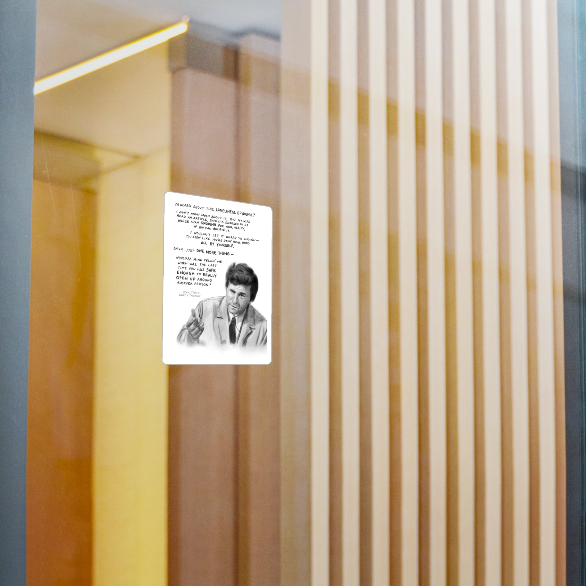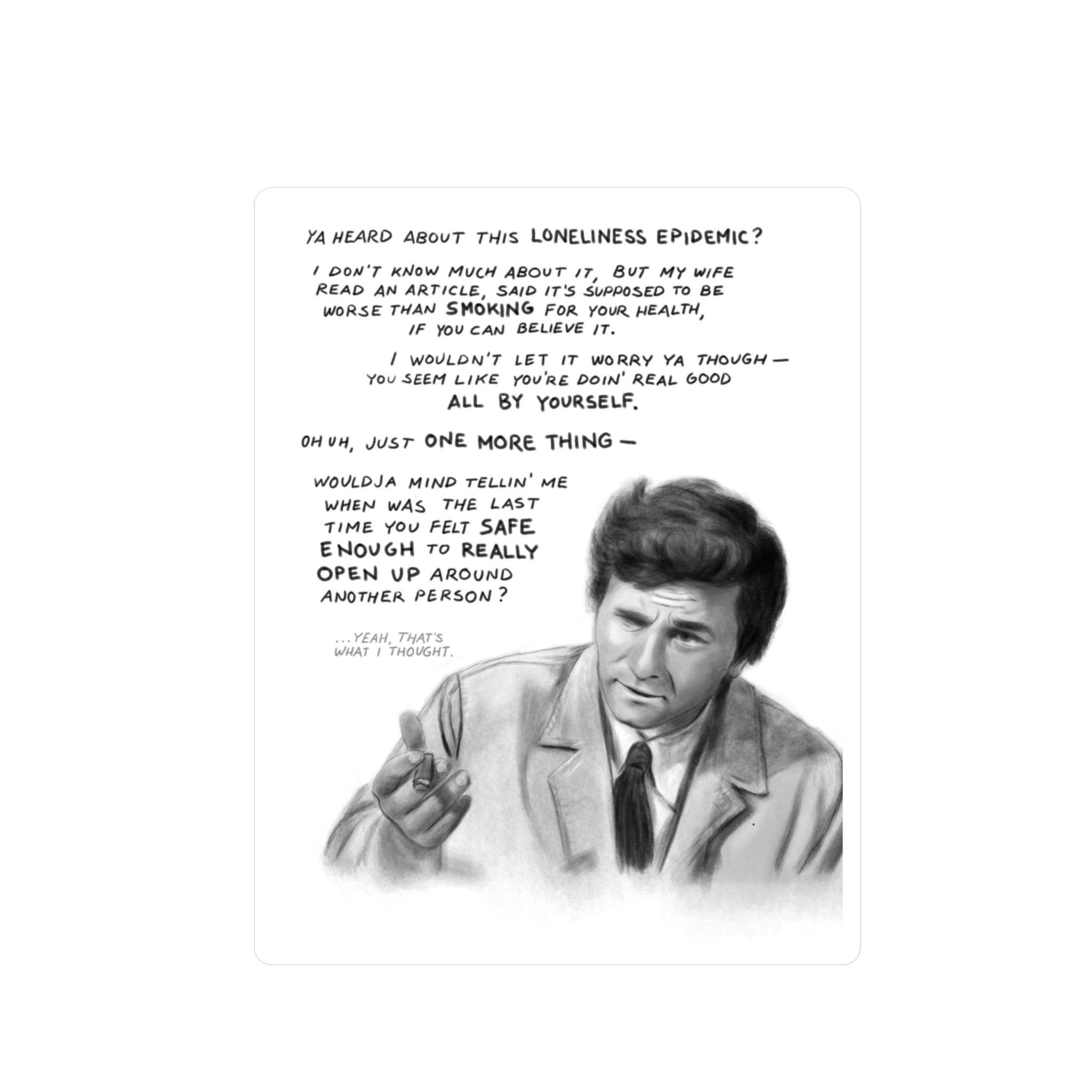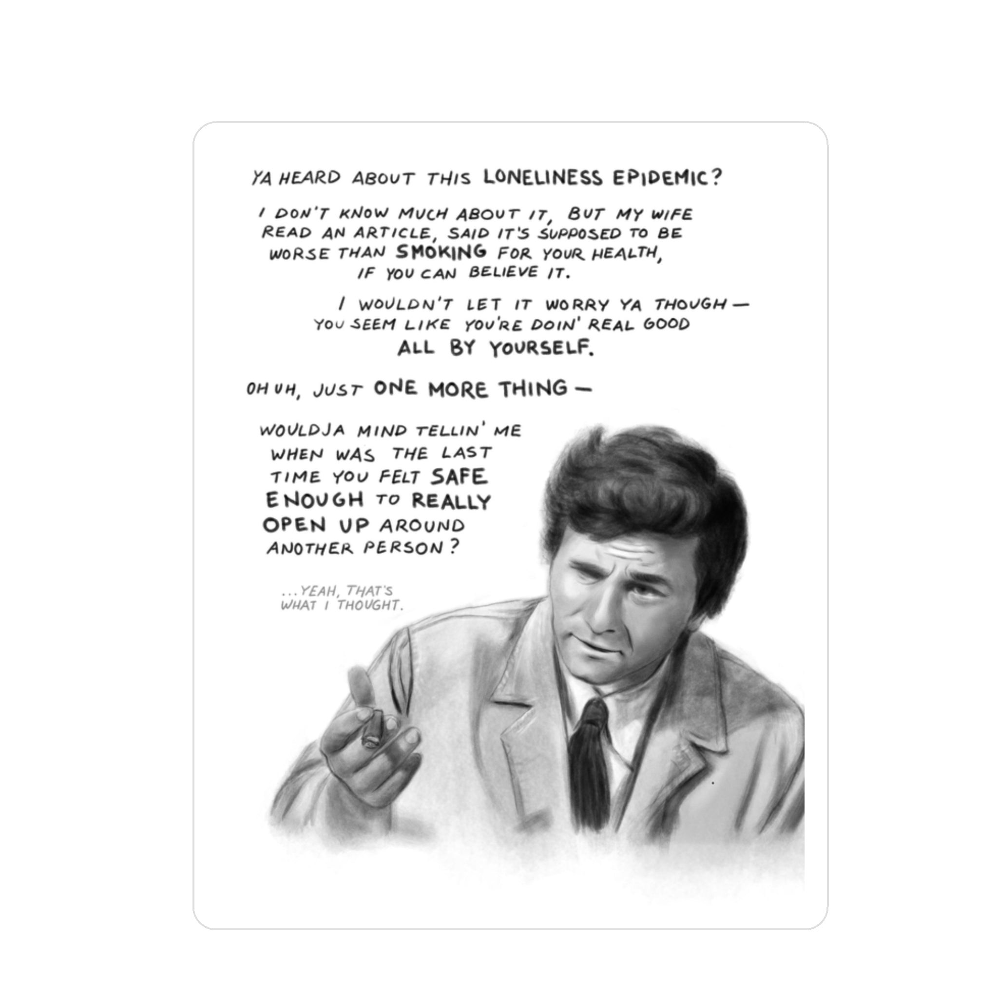 He solved mysteries with curiosity, connection, and authenticity—and now he can help you decorate your laptop, notebook, or water bottle with the same energy. This Columbo sticker features original artwork created by the Bloomington Center for Connection community, celebrating everyone’s favorite rumpled detective and his gentle knack for getting to the truth.