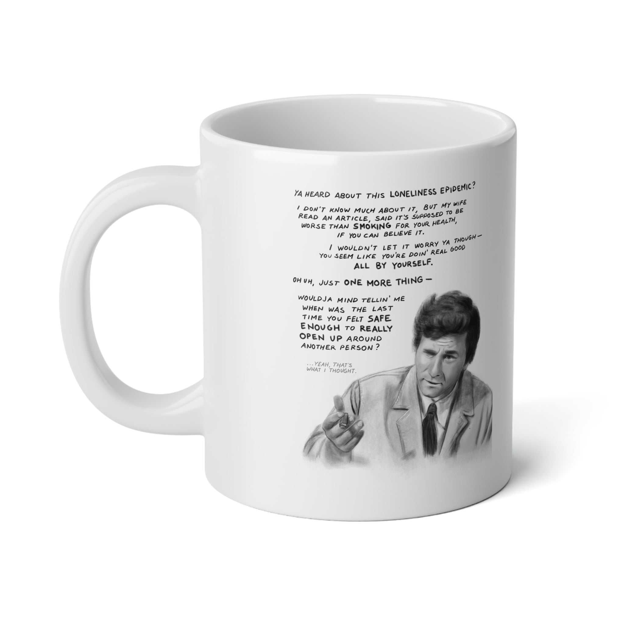 Start your day the Columbo way—curious, authentic, and just a little rumpled. This jumbo 20oz mug is perfect for anyone who likes their coffee strong, their questions gentle, and their heart open.