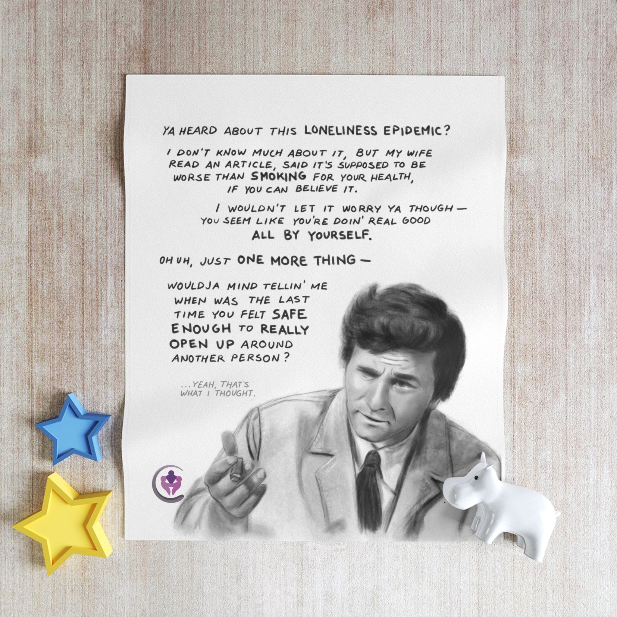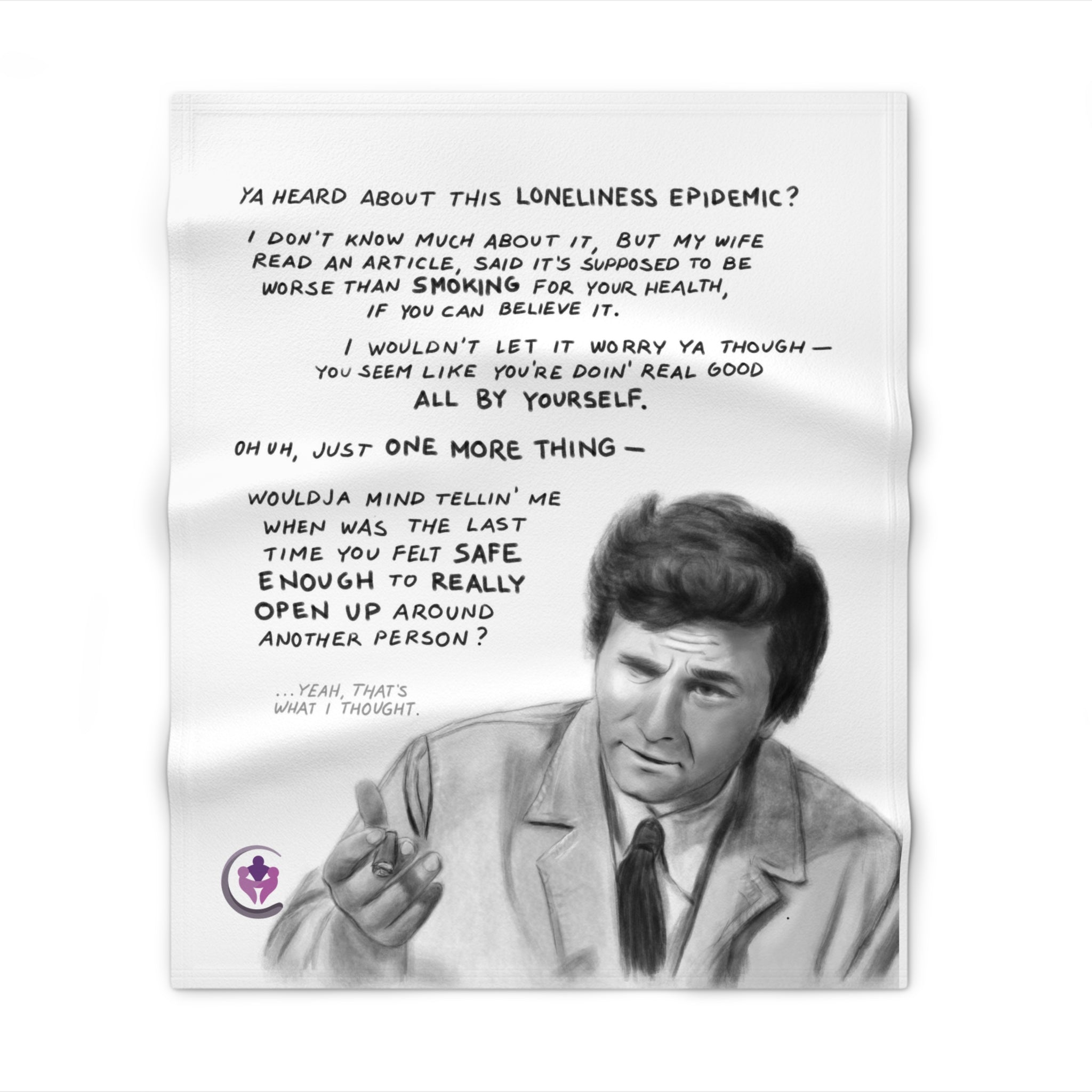 Surrounding a hand-drawn portrait of Peter Falk as Columbo is a quote that reminds us: sometimes the real mystery isn’t who did it, but who we feel safe enough to be ourselves with.